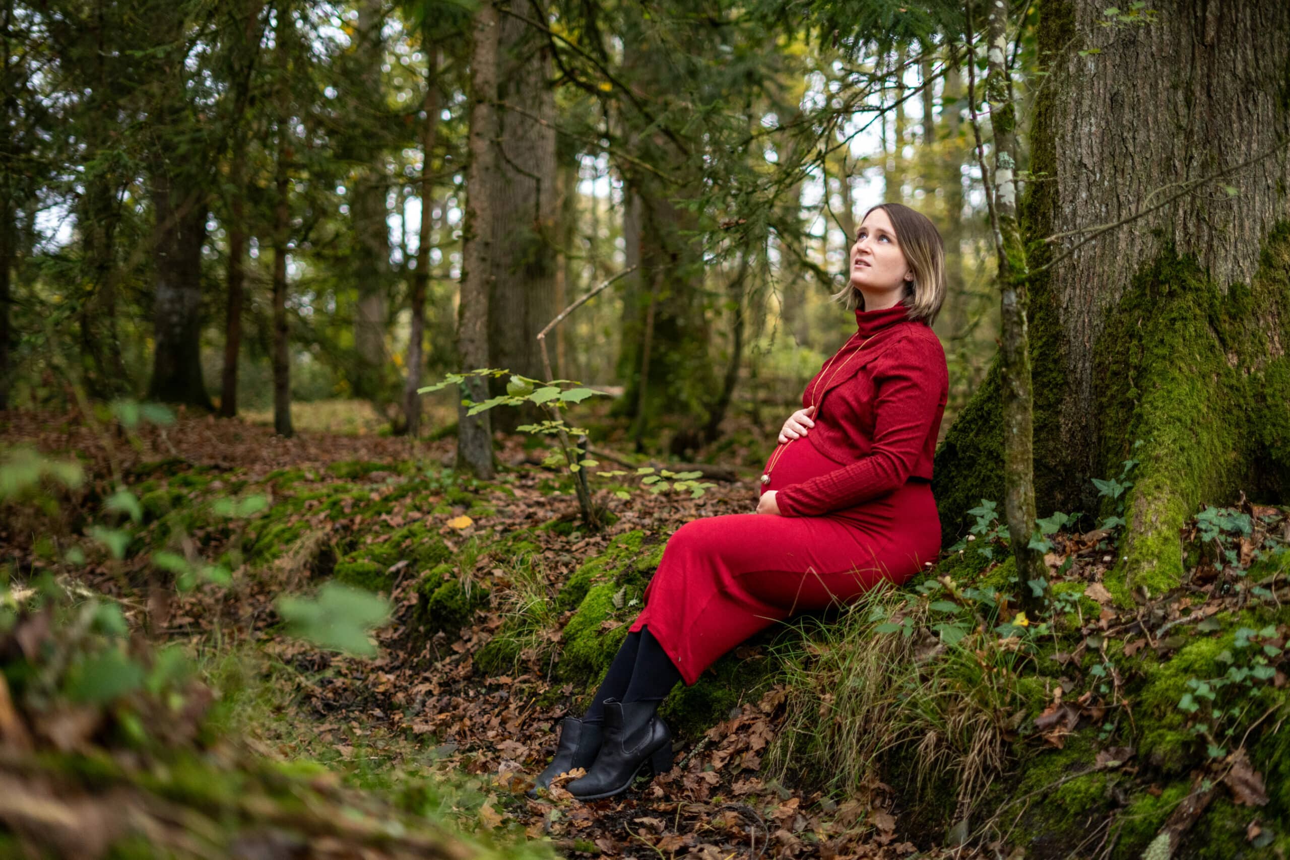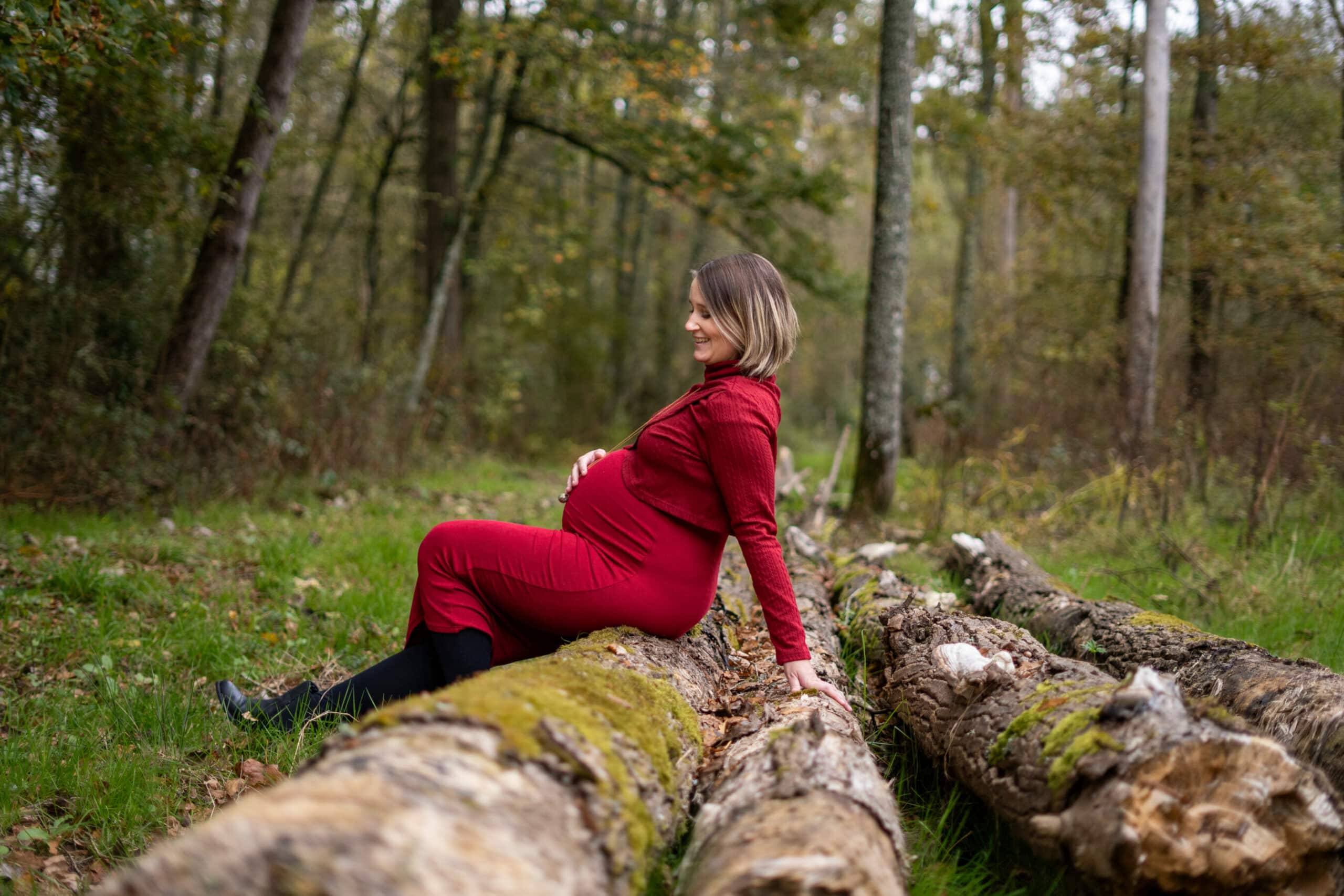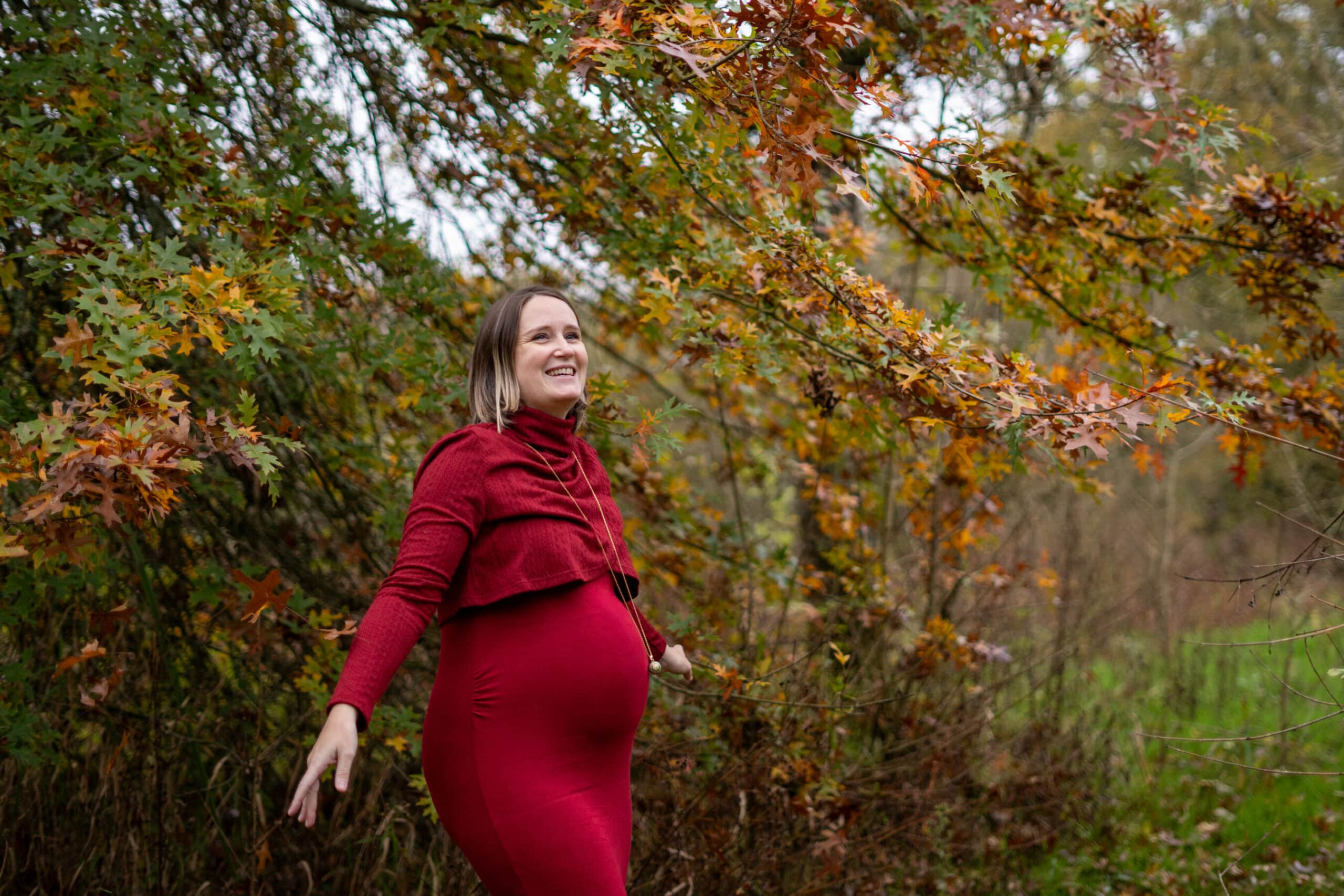 Marlène voulait une séance dans la forêt, seule avec son joli ventre pour une parfaite connexion avec elle-même et son bébé ! Elle a opté pour une splendide robe bordeaux qui s’accorde parfaitement avec les couleurs de l’automne !